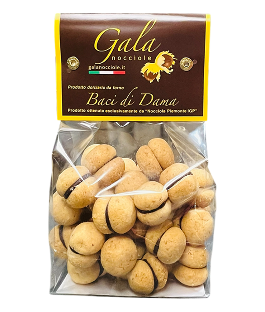 Die legendären Baci di Dama – „Damenküsse“ – gehören zu den feinsten Gebäckspezialitäten des Piemonts. Zwei zarte Haselnuss- oder Mandelkekse umschließen eine cremige Schicht feinster Schokolade und ergeben so ein harmonisches Geschmackserlebnis, das auf der Zunge schmilzt.