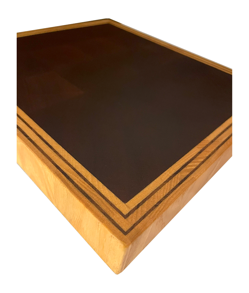 Die Umrandung aus Esche und Sapele verleiht diesem Schneidbrett eine elegante und außergewöhnliche Optik. In Südafrika werden Bretter dieser Größe oft in Bars zum Schneiden von z.B. Limetten und anderen Früchten verwendet – ein klares Statement für Stil und Genuss im gehobenen Ambiente.