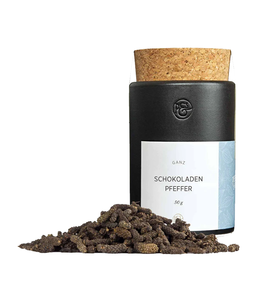 Schokoladenpfeffer, eine besondere Variante des Langen Pfeffers, ist eine seltene Delikatesse mit nussig-erdigem Aroma, warmer, milder Schärfe und dezenten Kakao- oder Schokoladennoten, die sich erst nach dem Mahlen voll entfalten. Oft leicht betäubend, ergänzt er sowohl Wild und dunkles Fleisch als auch Desserts und frisches Obst auf einzigartige Weise. Am besten wird er frisch gemahlen oder im Mörser zubereitet und erst kurz vor dem Servieren zugegeben, um das komplexe Geschmacksprofil zu bewahren – eine harmonische Balance aus Würze und Süße.