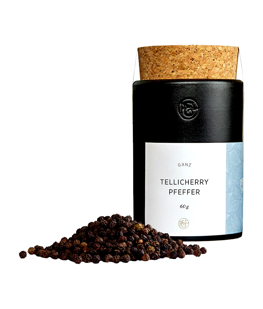 Tellicherry-Pfeffer ist eine besonders hochwertige Sorte schwarzen Pfeffers aus Indien. Benannt nach der Hafenstadt Thalassery an der Malabarküste, zeichnet er sich durch große, vollreife Pfefferkörner aus. Sein Geschmack ist intensiv und aromatisch mit nussigen, fruchtigen Nuancen sowie einer feinen, warmen Schärfe und holzigen Noten. Gewonnen aus Piper nigrum und erst bei vollständiger Reife geerntet, gilt Tellicherry als einer der edelsten schwarzen Pfeffer weltweit.